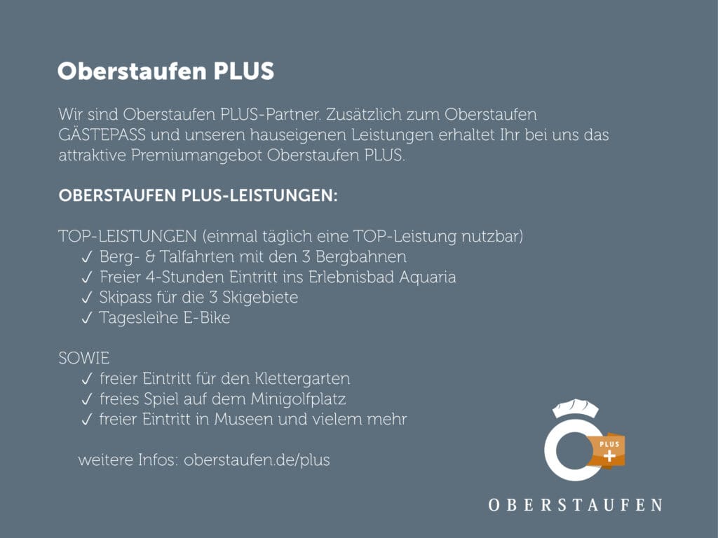 Die Eibele Chalets sind Partner von Oberstaufen PLUS: Zusätzlich zu unseren Leistungen erhalten Sie bei uns Ihre Gästekarte mit Oberstaufen PLUS (Mehrzweck-Gutschein) und genießen damit attraktive Vorteile und Erlebnisse für die Dauer Ihres Aufenthaltes.